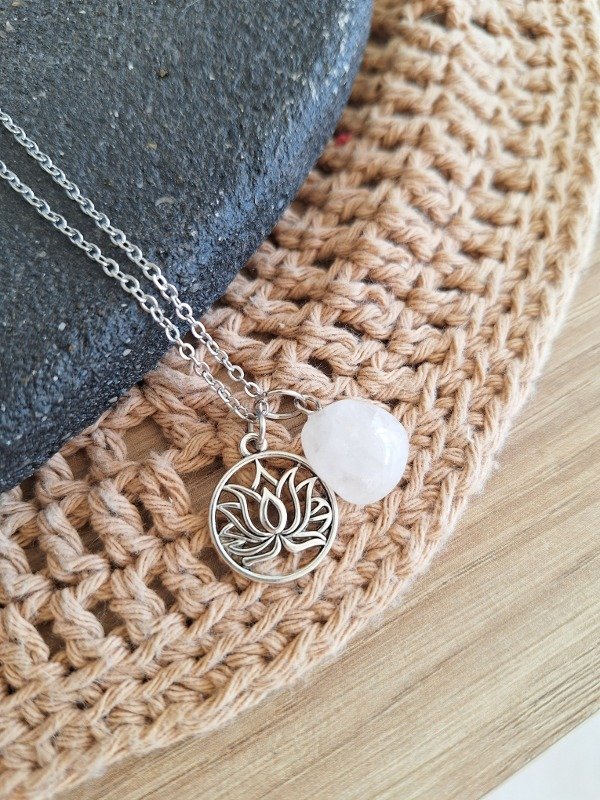 Amuleto con piedra de cuarzo blanco y dije de flor de loto. Incluye cadenita de acero quirúrgico simple de 50cms de regalo.