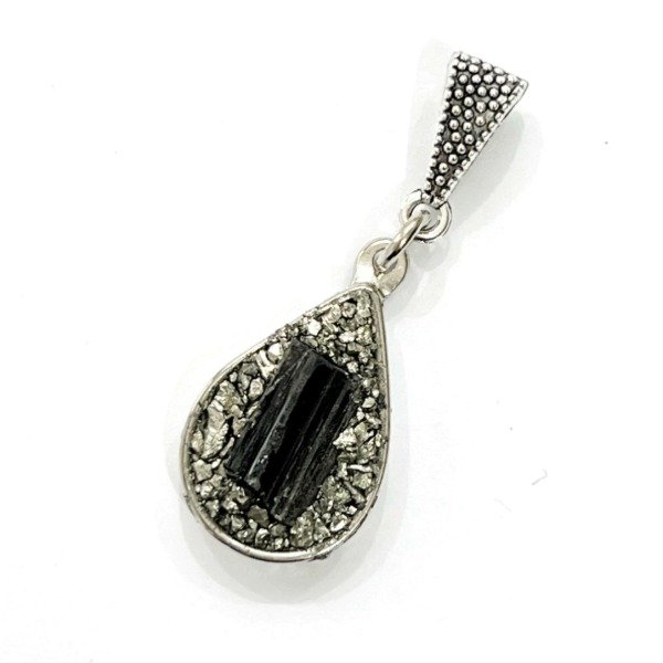 Dije gota de pirita y turmalina negra. Incluye cadenita de acero quirúrgico simple de 50cms