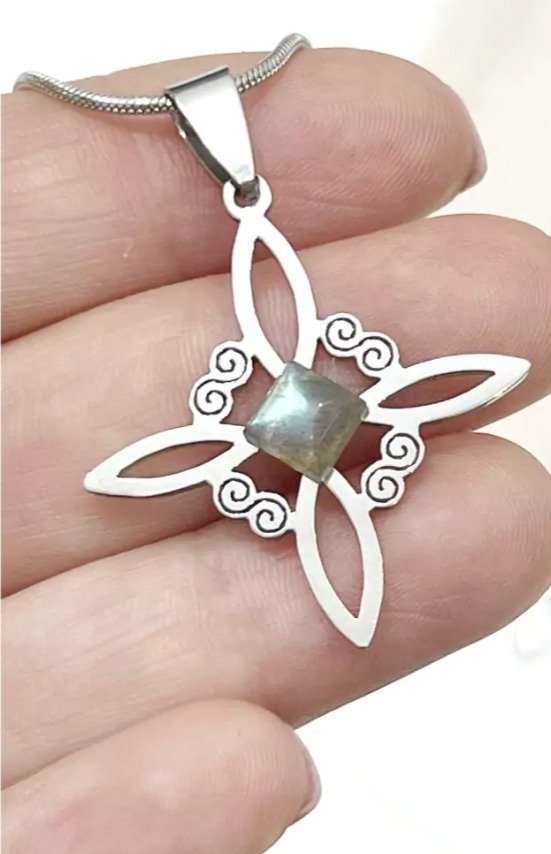 Nudo de bruja grande de acero quirúrgico con piedra de labradorita. Incluye cadenita de acero quirúrgico simple.