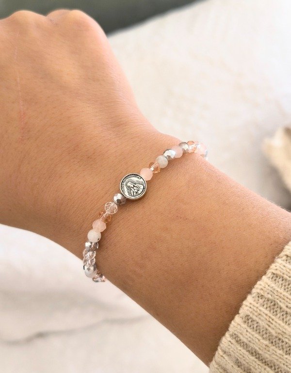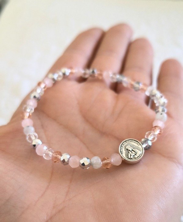 Hecha A MANO con elástico de alta resistencia, combina piedra de la luna en tonos suaves con cristales de roca facerados, y una medalla pasante de la Virgen de Guadalupe (símbolo de protección y guía)