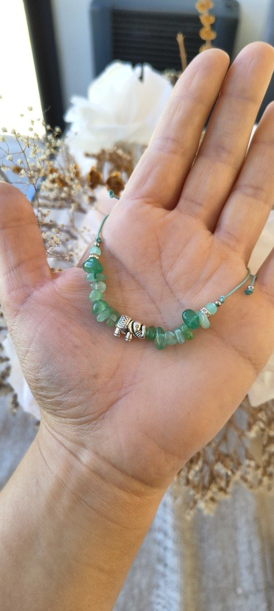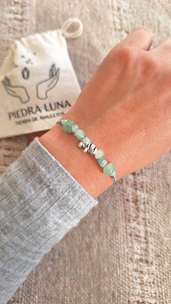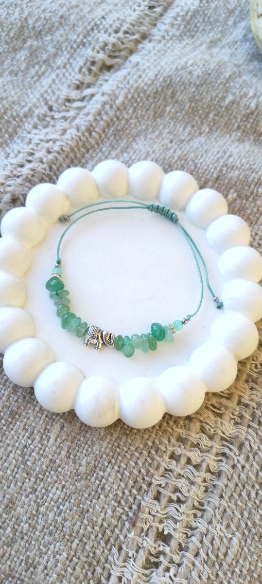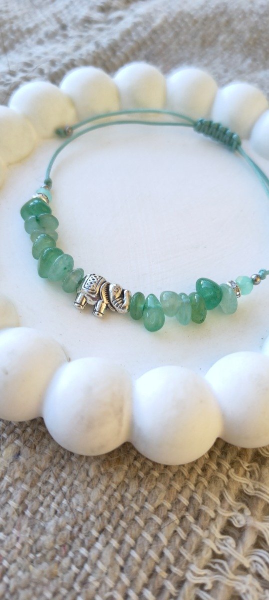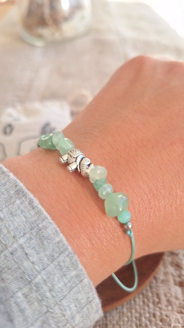 Hecha A MANO con hilo chino verde regulable, combina escallas de cuarzo verde (piedra de la sanación y el equilibrio emocional), con un dije de elefante (símbolo de sabiduría, protección y fuerza interior)
